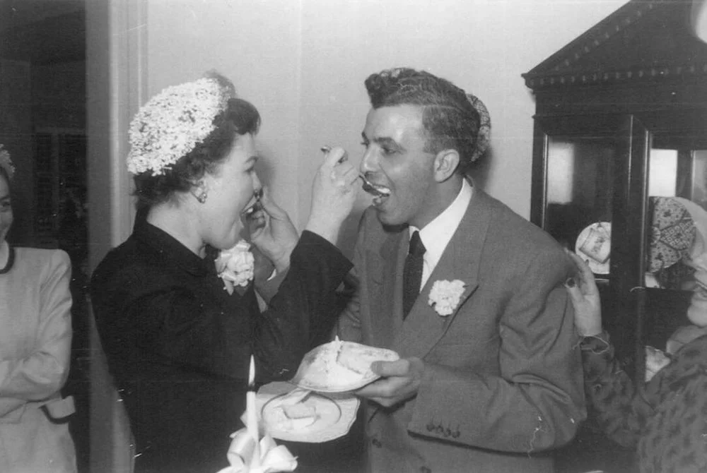Marion and George Naifeh sharing cake at their wedding reception in Washington.