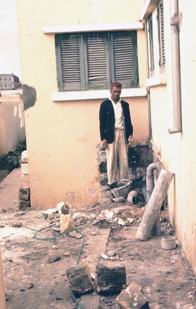 The replacement plumber standing, perplexed, outside the Naifehs' home in Baida.