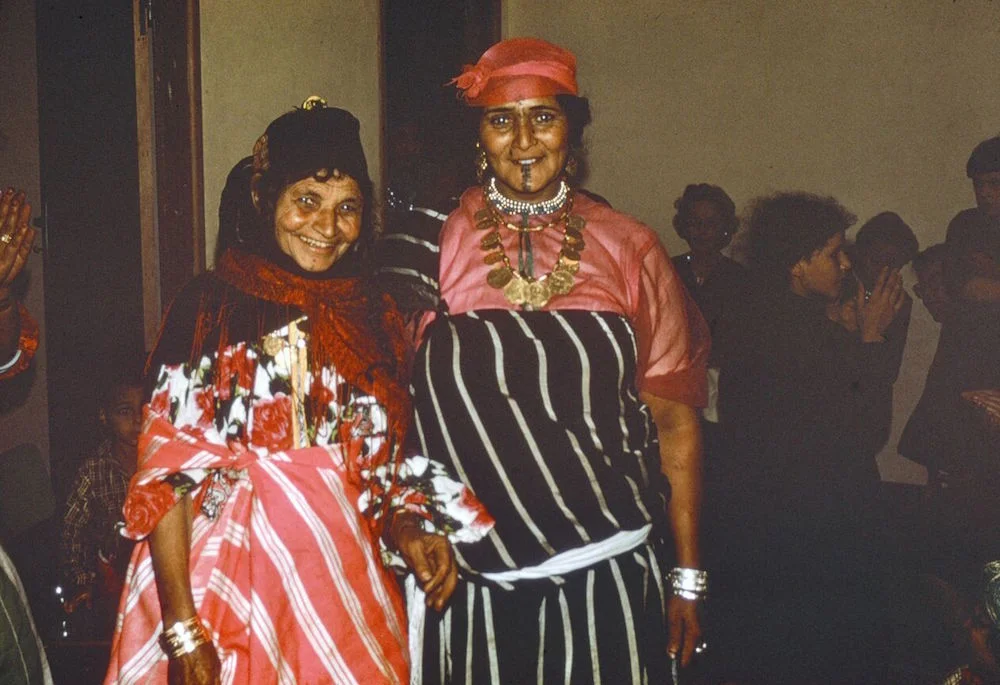Abdul Gader's mother at left, with a professional dancer, at a bride's party.