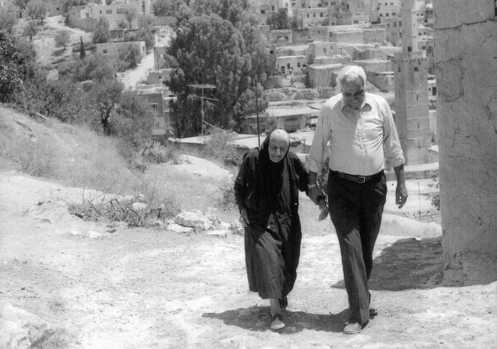 George walking with his aunt Wadia in Ajlun, the town where his father was born.